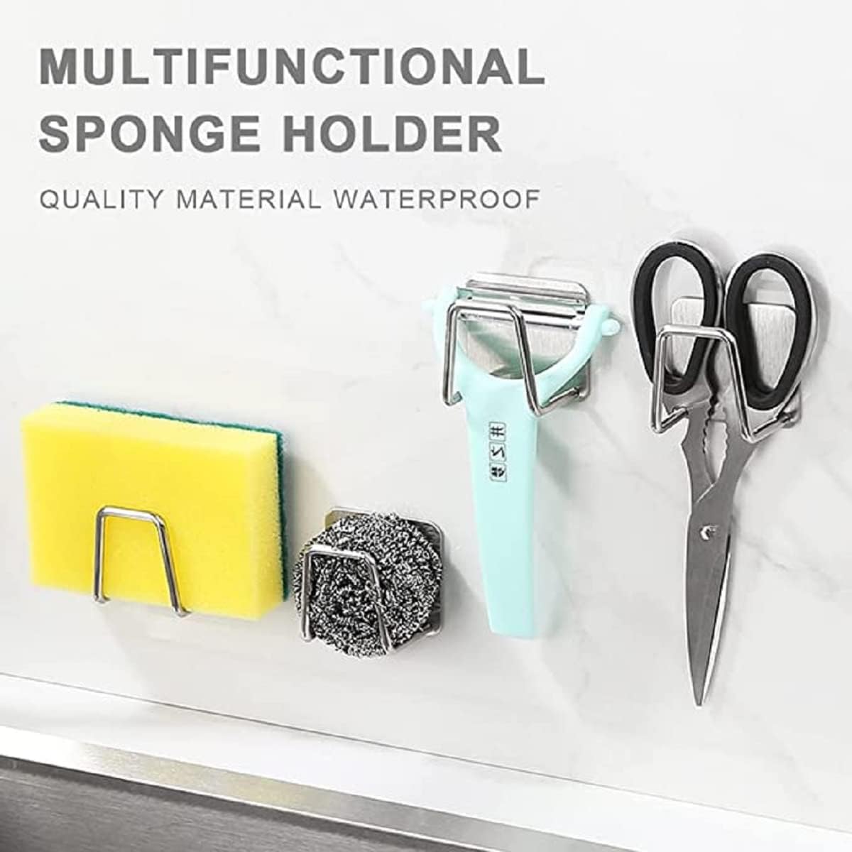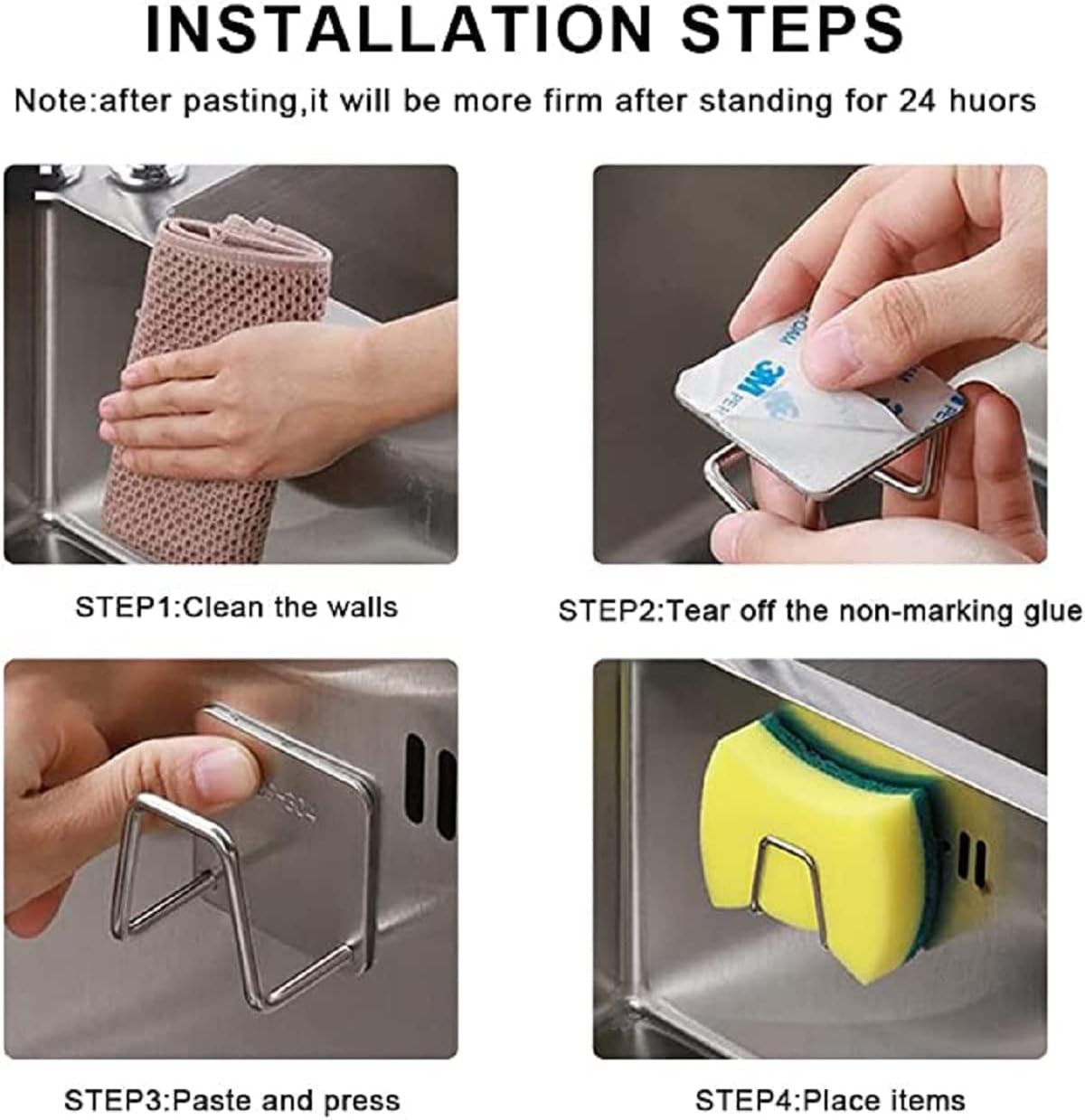 - ➤ Material – The sponge holder is made of superior 304 stainless steel, waterproof and rust-proof, sturdy and durable, with powerful 3M adhesive sticker, which is more reliable than the suction cup.
