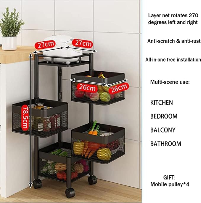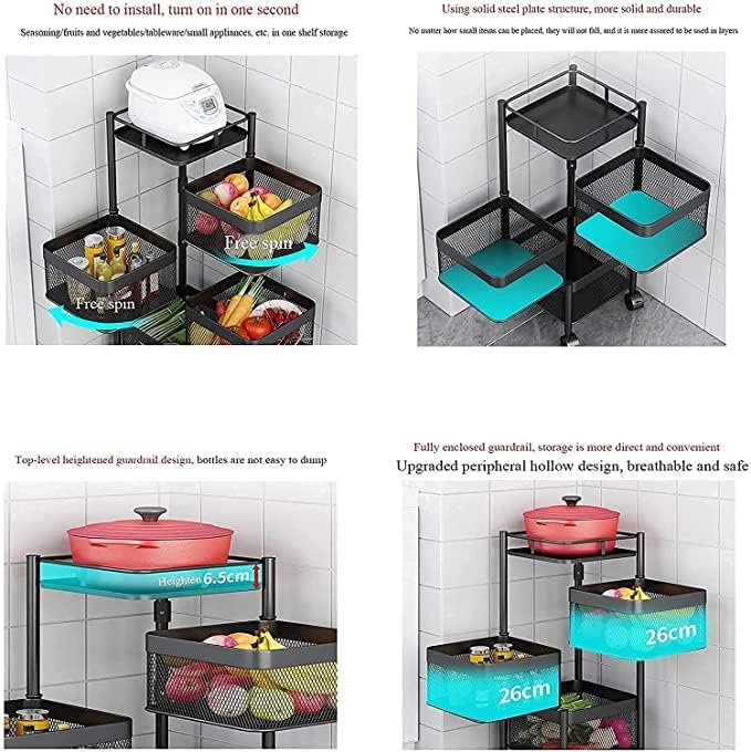 • 【ROTATING & BREATHABLE BASKET】Rotating storage rack is designed with an encrypted metal mesh, which has high air permeability and can keep fruits and vegetables fresh for a long time; the hollow design of the fully enclosed guardrail prevents small objects from falling; the rotating design can quickly pick up and place items