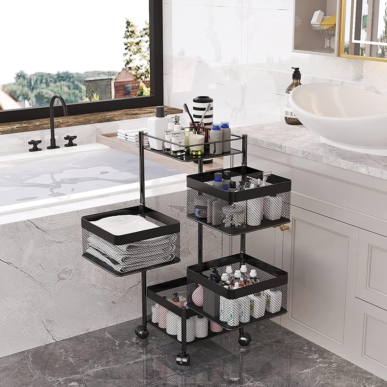 • 【STURDY & DURABLE】Rotating storage shelf rack are made of iron which is sturdy and not easily; Sprayed with black powder coating, it is rust and waterproof, not peeling off or tarnish easily,even in the bathroom, laundry room and other humid environments you don’t have to worry about it