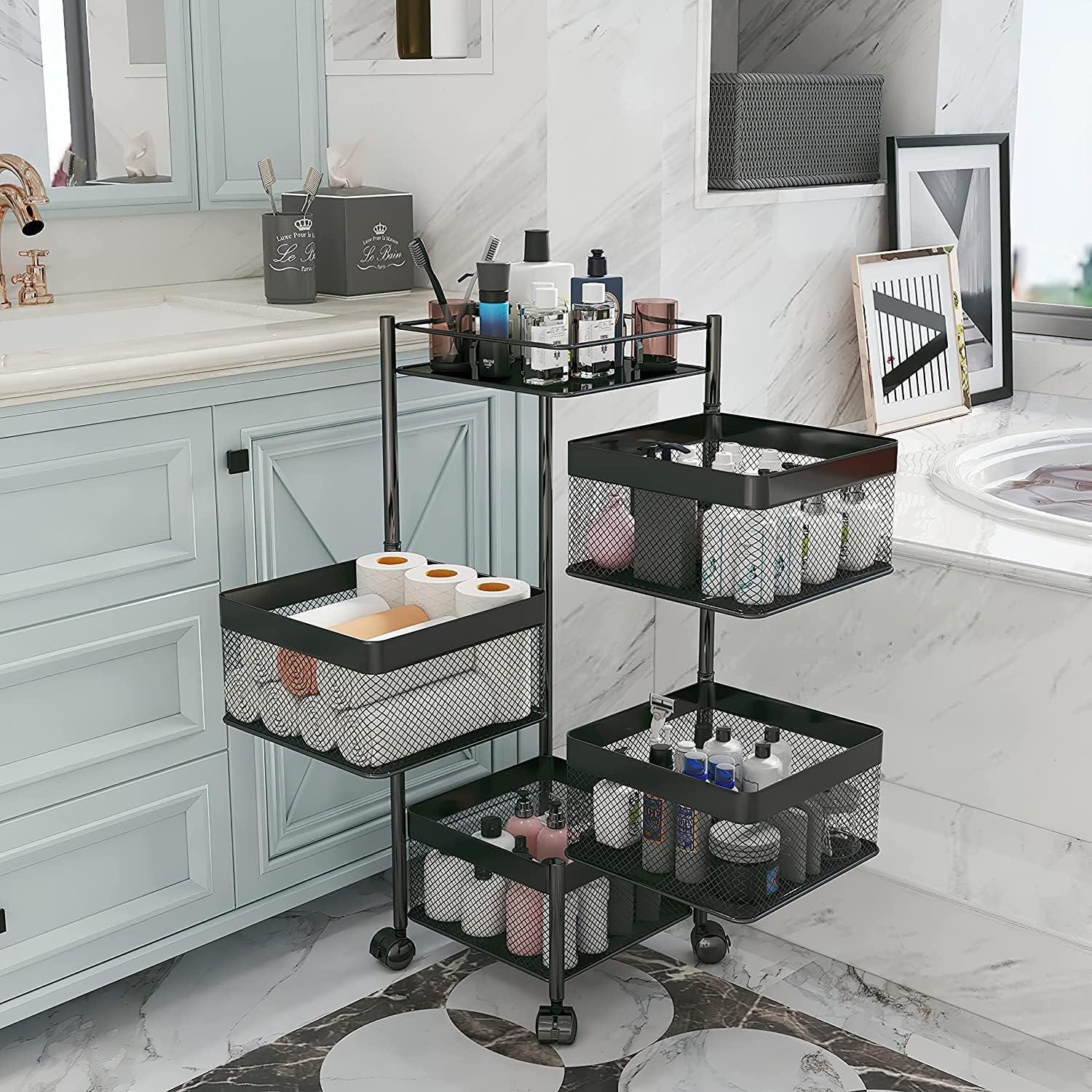 • 【LARGE CAPACITY】Metal Storage Baskets With Wheels size is 30.1”H*9.36″W*9.36″L, the height of each basket is 5.9″. And built-in 4 Rotable storage bins with steel tabletop,it has enough capacity