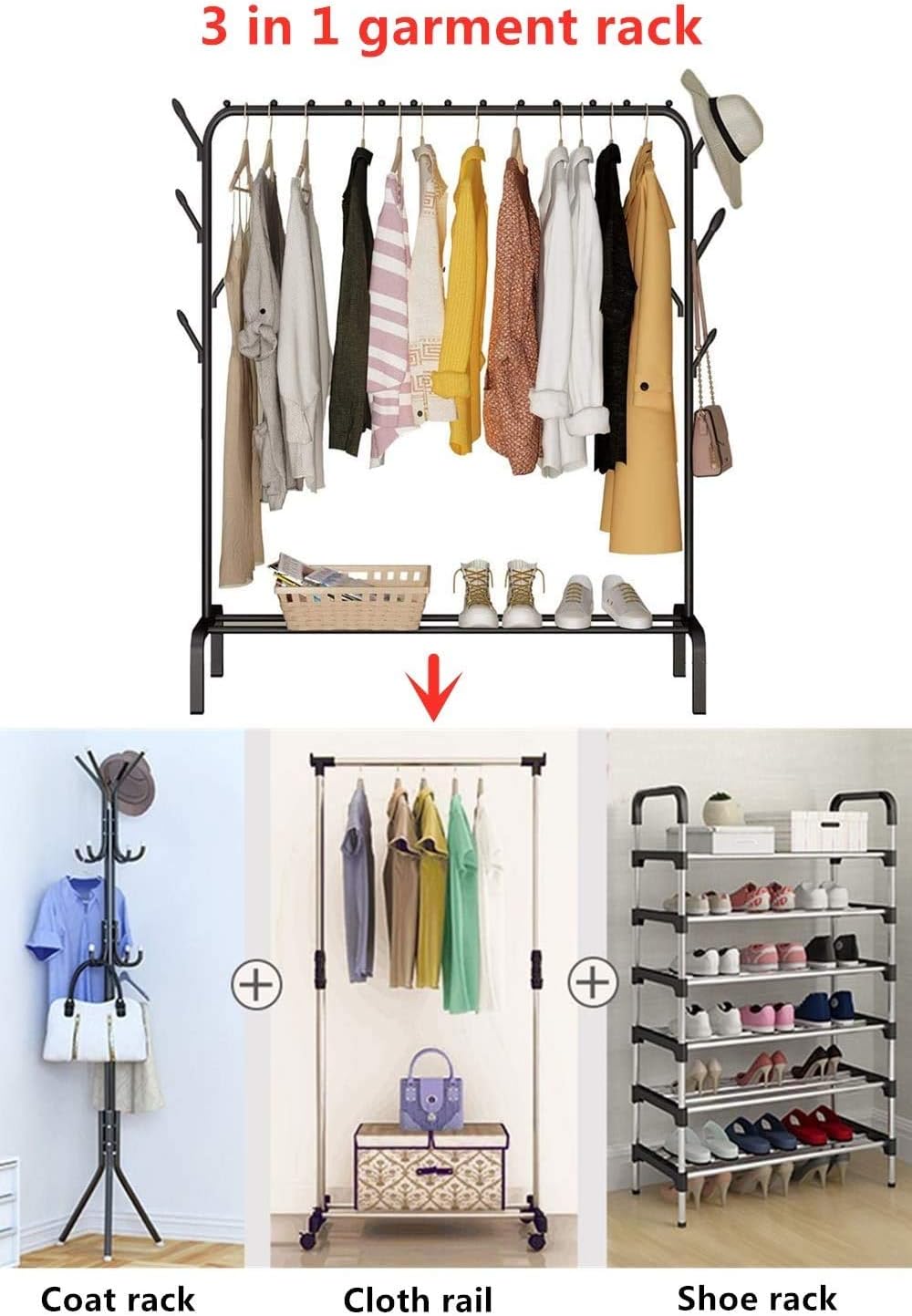 • 怐Multi purpose garment rack怑110cm ultra long hanging rail for all family’s clothes, 8pcs branch hook as hat rack for hats, scarf and handbags, bottom storage shelf as shoe rack for shoes, books or other accessories.