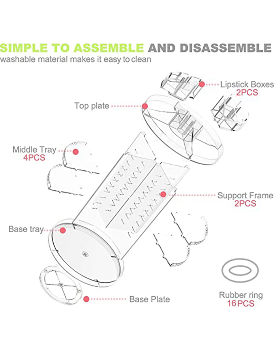 - LARGE CAPACITY: Measures 15inch in height and 10.3inch in diameter (base) when assembled.Accommodates at least 60 makeup brushes, 30 skincare products and other accessories including lipsticks, nail polish, eyeliner and more.